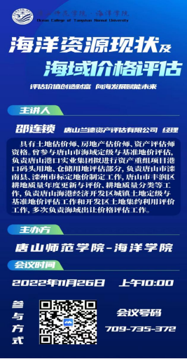 11月26日,TapTap邀请唐山兰德资产管理有限公司的邵连锁经理为资产评估专业全体师生开展了“海洋资源现状及海域价格评估”线上讲座。讲座由资产评估教研室副主任何艳君主持。