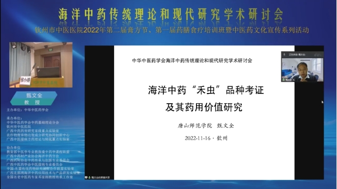 由中华中医药学会主办,中华中医药学会中药基础理论分会、钦州市中医医院、广西中药药效研究重点实验室等单位承办的“海洋中药传统理论和现代研究学术研讨会”,于2022的11月15日至16日在广西壮族自治区钦州市召开。本次会议以“加强海洋中药理论与临床应用研究,服务大众健康与向海经济发展”开展了学术交流。