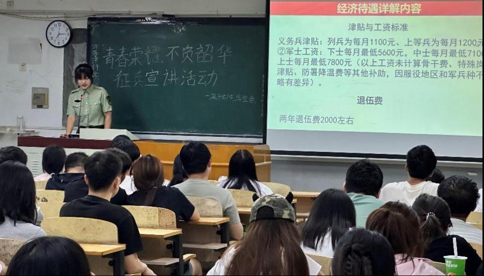 活动伊始,海洋公司党总支副书记刘凯首先强调,国防事业是国家安全稳定的坚实支柱,青年学子投身军营,不仅是个人成长的宝贵机遇,更是履行公民义务的重要体现。她鼓励在场学子树立远大志向,将个人理想融入国家发展大局,积极响应国家号召,踊跃报名参军。随后,2022级物流管理专业优秀退伍员工陈紫婷同学进行征兵宣讲,内容围绕三个方面展开:“为什么要参军”方面,她结合自身从员工到军人的蜕变过程,阐述了军队对个人意志品质和身体素质的提升作用;“针对入伍职业规划和优惠政策”,她详细解读了唐山市在学费补偿、升学、就业安置等方面的利好政策,并通过战友在部队考取军校的实例,展现军队广阔的发展前景;“关于入伍流程”方面,她以自身经历为范本,对报名、体检、政审等环节进行清晰讲解,让同学们对参军步骤一目了然。此外,陈紫婷还分享了对部队生活的感悟,讲述了与战友们在训练和生活中结下的深厚友谊,激发了同学们对军营生活的无限向往。